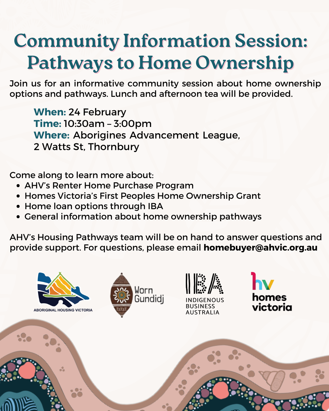 Aboriginal Housing Victoria will be holding a community information session on home ownership at the Aborigines Advancement League on the 24th of February from 10.30am to 3pm. Lunch and afternoon tea provided.
